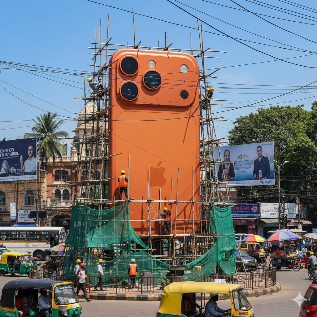 «Crea una estatua gigante hiperrealista basada en la foto proporcionada, manteniendo la cara original exactamente igual sin cambios. La estatua se yergue en medio de una rotonda en Bangalore, cerca de un famoso monumento histórico. Está completa al 70 %, con la mayor parte de su estructura detallada y terminada, mientras que el 10 % restante aún está en construcción, rodeado de andamios. Algunos obreros con cascos amarillos y chalecos naranjas están soldando, escalando y terminando las últimas secciones. Solo se ve una pequeña estructura metálica expuesta en la parte inacabada. El fondo muestra la atmósfera realista de la ciudad de Bangalore: calles abarrotadas con coloridos rickshaws, autobuses abarrotados y coches pequeños circulando por la rotonda. Vendedores ambulantes con puestos de té, carritos de fruta y sombrillas de colores bordean la carretera. Letreros de tiendas, grandes vallas publicitarias y cables eléctricos colgantes desordenados se entrecruzan sobre las calles, creando la atmósfera típica de la ciudad de Bangalore. El cielo diurno brilla con árboles tropicales y un ambiente animado y bullicioso».